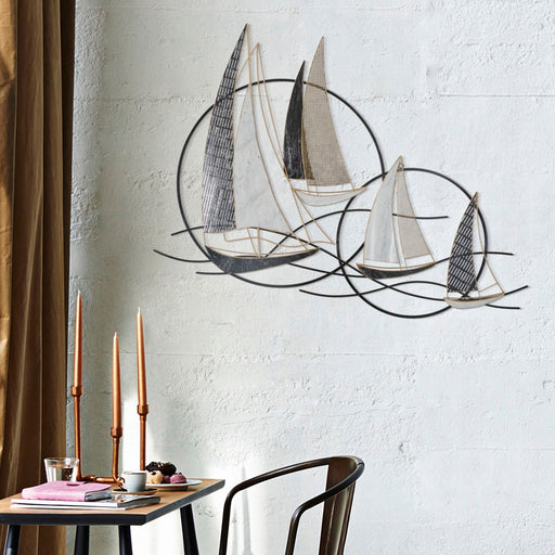 IDEACASAPanou decorativ metalic 3D care infatiseaza un grup de barci cu vele. Designul aminteste de libertate si briza marii. Stil: Glam Culoare: Multicolo...