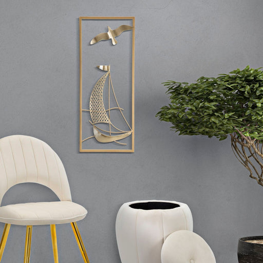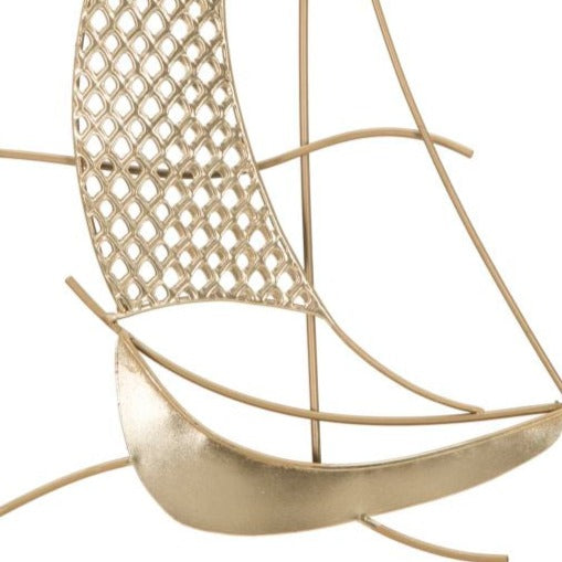 IDEACASAPanou decorativ 3D din metal auriu ilustrând o barca cu pânze si un pescarus zburator, inchise intr-un cadru. Designul aminteste de libertate si br...
