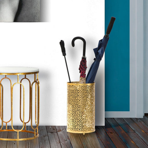 Suport pentru umbrele rotund din metal auriu. Incrustatiile obisnuite il fac o completare practica ce nu poate lipsi in fiecare intrare cu un stil ...