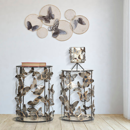 IDEACASAPanou decorativ 3D de perete compus din fluturi multicolori si oglinzi rotunde inchise intr -un cadru dreptunghiular STIL: GLAM CULOARE: MULTICOLOR...