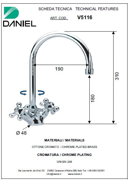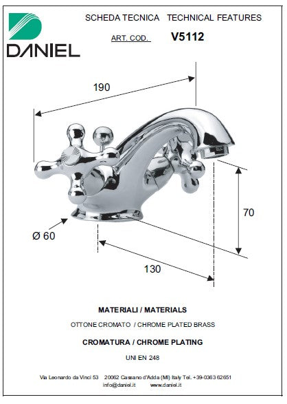 DANIELBaterie lavoar daniel rubinetterie made in italy revival v5112 FINISAJ:LUCIOS CULOARE:CROM ACCESORII :VENTIL